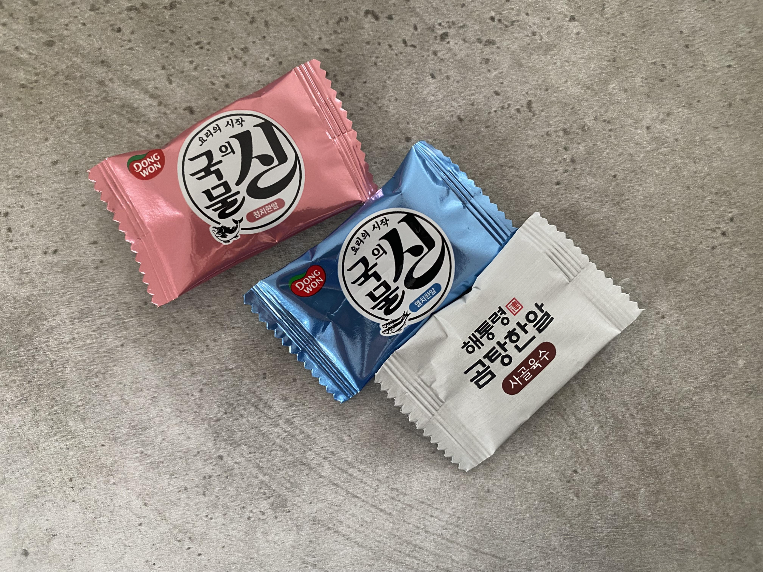 코인육수는 발명이라는 말을 붙여야 된다고 생각합니다. 어떻게 이런 게 지금껏 없었나 싶을 정도인데요. 3년 전에 한국에 갔었을 때는 육수팩을 사 왔었어요. 근데 그게 마트에서는 냉장고에 들어있어서 들고 오는 동안 제품이 상할까 봐 불안했었거든요. 근데 작년에 코인육수를 보고 바로 사 와서 요리할 때 써봤는데, 아주 간편하고 좋더라고요. 그래서 올해도 찾아보니.. 종류가 얼마나 많아졌는지. 놀랐어요. 2022년에 한국에서 사 왔을 땐 분명히 한 브랜드만 있었던 것 같거든요. 어떤 게 원조이고 어떤 게 아류인지 모르겠더라고요. 너도나도 코인육수를 만들어서 상품화한 것 같아요. 저는 이마트 트레이더스에서 코인육수 쇼핑을 했는데 이렇게 3종류가 있어서 이걸 다 사 왔답니다. 파란색 멸치한알과 곰탕한알은 뭐 여기저기 쓰일 곳이 많고, 분홍색 참치한알 같은 경우엔 가쓰오부시가 들어간 육수맛이 나요. 우동 끓여 먹을 때 쓰니까 좋았어요. 두고두고 먹는 퀄리티 높은 김치를 만들 생각이 아니시라면 코인육수로 김치육수 만들어도 좋겠단 생각을 했어요. 전 올해 떡국도 곰탕한알로 끓이려고요ㅎㅎ