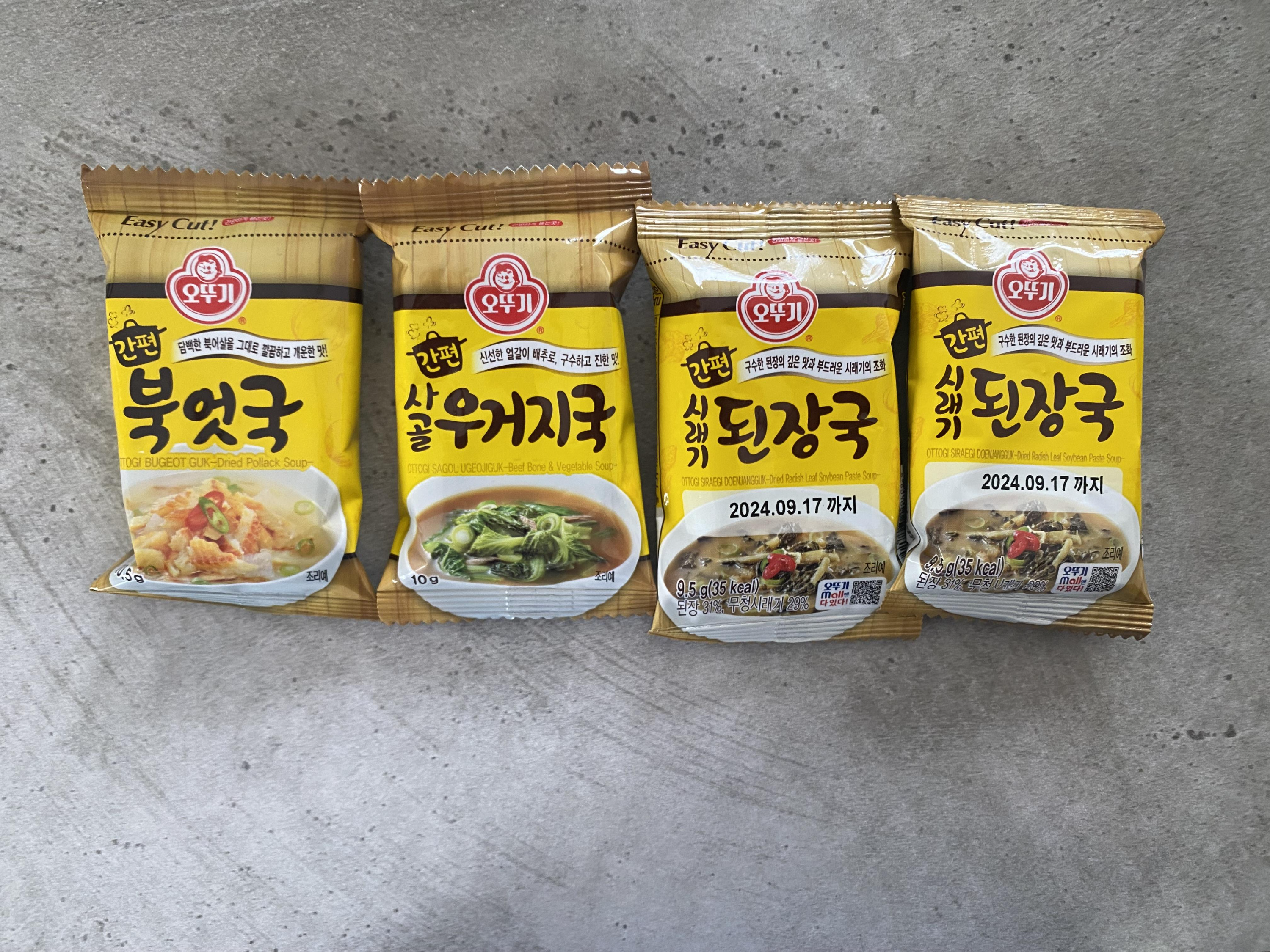2분 완성 국이고 한 팩에 1인분양이 들어있어요. 이게 맛이 괜찮아요ㅋㅋ 전혀 기대 안 하고 한 번 먹어봤었는데, 생각보다 맛있어서 놀랐어요. 2년 전에는 닭곰탕도 있었는데, 이제는 없는 건지 작년에도 못 샀고, 올해도 못 샀어요. 닭 한 마리 할 때 하나씩 넣어먹으면 조금 더 맛있었는데, 이제는 못 넣어요. 북엇국, 우거짓국, 된장국 말고 미역국도 있어요. 그리고 이 간편 국 같은 경우에도 오뚜기 말고 다양하게 뭐가 많아요. 국종류도 넘치게 많아서 마트에서 둘러보시면 고르기 힘드실 거예요.