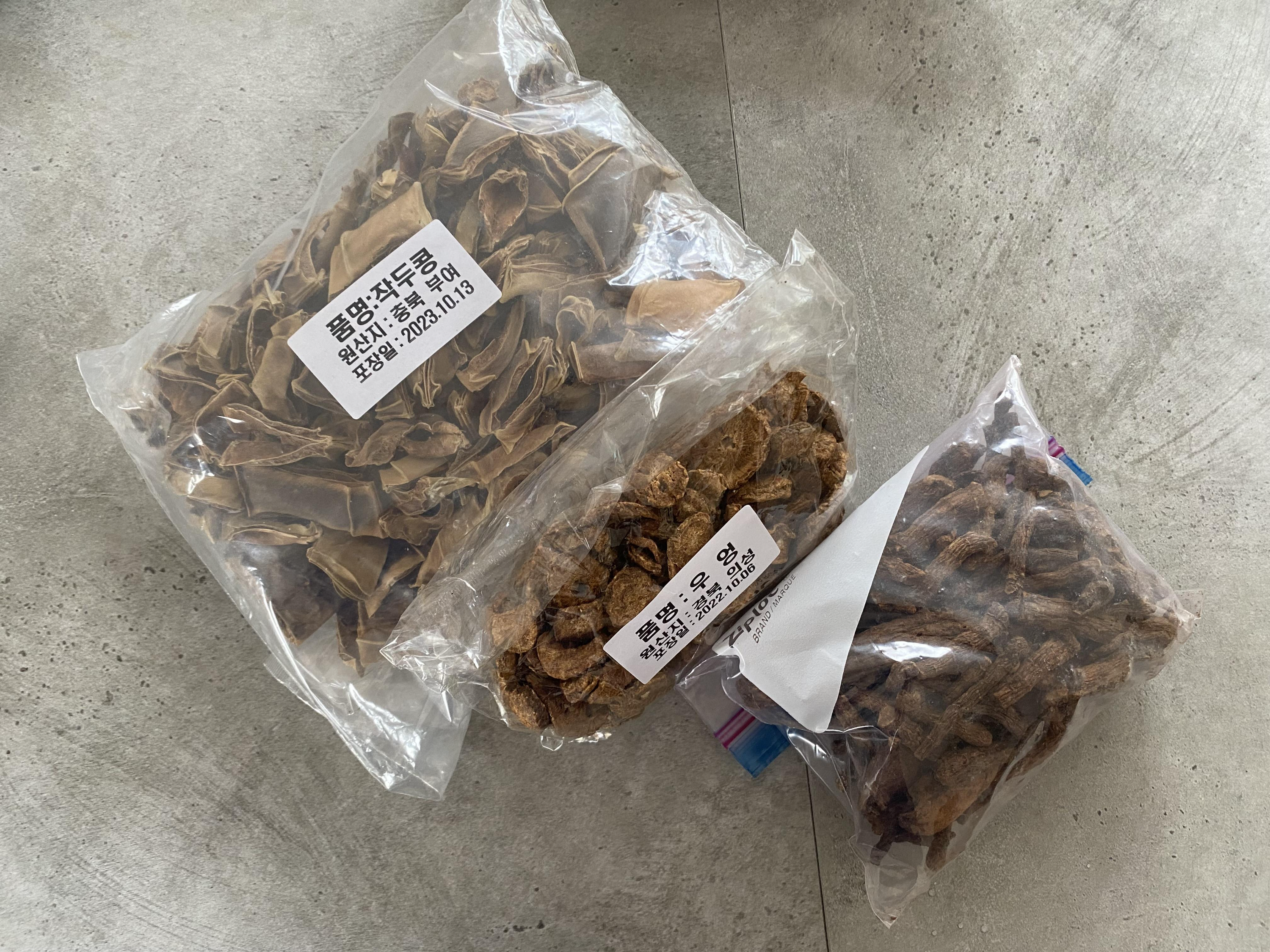 차 우려마실 말린 것들이에요. 이걸 뭐라 불러야 할지 모르겠네요. 작두콩, 우엉, 둥굴레를 사 왔어요. 저정도 양이면 3년은 우려마실 양이에요. 저렇게 까지 많이 필요 없지만, 저게 있으면 우리도 즐기고, 지인들에게 나눠주기 좋아요.