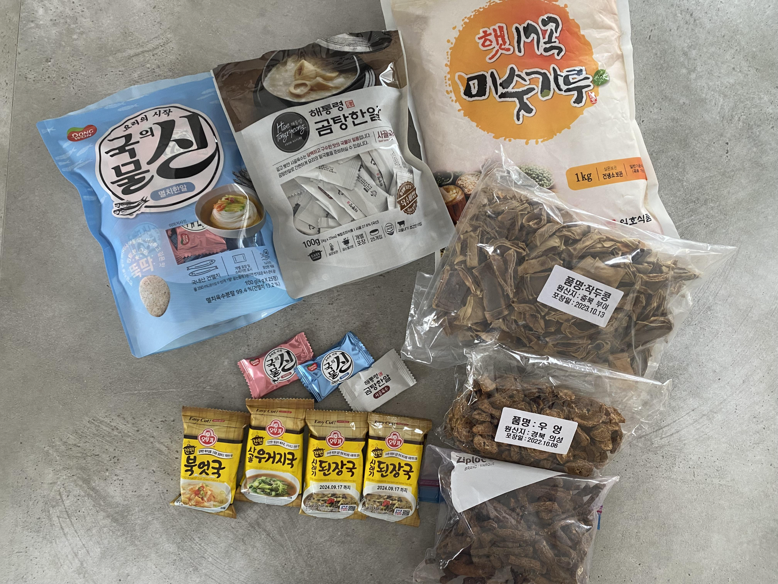 저는 코인육수와 2분 완성 국들, 미숫가루와 차 우려먹을 말린 것들을 꼽았어요. 그 외에 수건, 말린 나물들, 누룽지, 쫀디기 등이 있지만 그새 다 먹어서 사진이 없네요ㅎㅎ 수건 같은 경우는, 한국면이 촉감이 더 좋다고 하네요. 그래서 손수건이나 수건들을 한국에서 가지고 오는 사람들도 많아요. 여기 한인마트에 파는 말린 나물 종류가 그리 많지는 않아서 말린 나물을 좋아한다면 챙겨 오는 것도 좋아요. 누룽지도 직접 만들 순 있겠지만 맛있게 잘 만들어진 누룽지를 편하게 먹는 것도 좋아요~ 가볍기도 하고요. 작년엔 인스턴트커피랑 율무차, 곡물라테 같은 것들도 챙겨 왔었는데, 올해는 임신 중이라 챙겨 오지 않았네요. 이렇게 나열하면 깃털같이 가벼운 것들인데 모이면 무게가 어마어마해요.