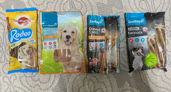 첫 번째는 강아지 육포예요. 육류가 함유되어 있어서 검역에 걸리지 않을까 했는데, 작년에도 올해에도 아무런 문제가 없었어요. 작년에 처음 사갔었는데, 이걸 들고 있으면 강아지가 벌써부터 냄새로 아는지 정신을 못 차리더라고요. 마치 잘 아는 간식인 마냥. 할아버지네 작은 강아지와 이모네 대형견을 위한 간식을 따로 준비했어요. 전 이 간식을 REWE에서 샀고요. 소형견 간식과 대형견 간식이 나눠져 있어요. 견크기를 보고 잘 사셔야 돼요. 작년엔 동생네 고양이 간식도 사갔었는데, 고양이는 간식을 가리는 것 같더라고요. 안 먹는다고 해서 이번엔 안 사갔어요.
